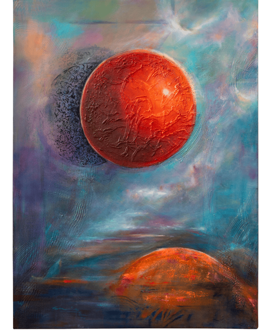This artwork explores cycles of presence and absence, of past, present, and future, and of higher consciousness, consciousness, and subconsciousness. It speaks of repetition, memory and return. Surrounding layers evoke cosmic space and shifting horizons where time is fluid rather than linear. The work reflects interconnected systems in constant orbit, balance, and transformation.
