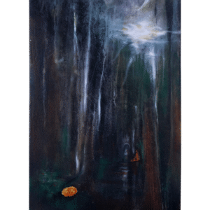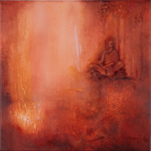 This painting explores stillness as a state of reflection. The vertical blue currents suggest infinite consciousness, while the subtle form rests in silence rather than action. Shiva here is not portrayed as a narrative, but as if witnessing dissolution where renewal and calm co-exist.